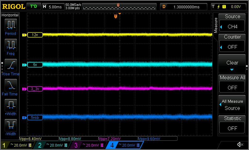3-Hold Up time ( thời gian lưu điện)Với tụ chính lên tới 560uF thì M12II EVO 620 dễ dàng vượt qua tiêu chuẩn ATX 16mS với 19,2mS . Đường 12V rơi khỏi vùng an toàn sau 23,2mS