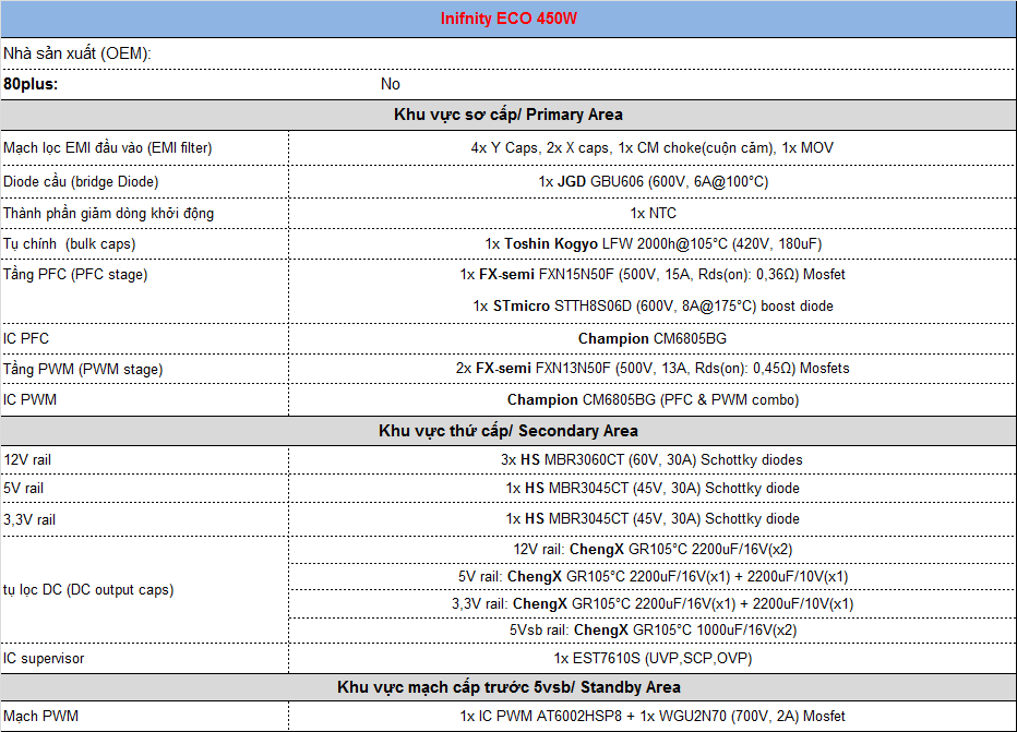 ECO 450W có platform hoàn toàn mới không liên quan gì tới người anh ECO 600W. Điểm đặc biệt của Platform này là sử dụng PCB sợi thủy tinh 2 lớp FR4 thường được sử dụng ở các PSU có công suất lớn, đây là điều chưa có NSX nào sử dụng cho phân khúc phổ thông mà họ chỉ sử dụng loại PCB bột giấy 1 lớp CEM-1 vì chi phí sản xuất PCBA sẽ thấp hơn nhiều.