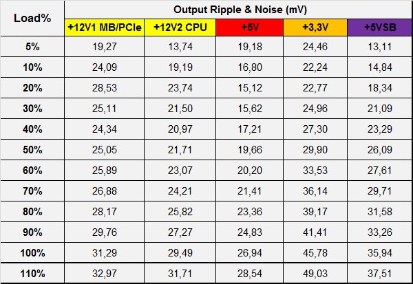 Ripple & Noise của VXP750SGVN Straight-Line ATX3.1/PCIe5.1 khá tốt, khi tối đa khoảng trên dưới 40mV cho cả 4 đường điện